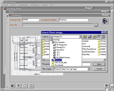 Manufactured Items are also stored in a database and can contain associated costs, markup and prices, as well as Drawings (scanned or exported from CAD/CAM programs into .jpg, .gif or .bmp formats), CNC Programs and comments.