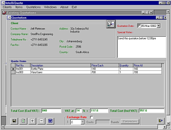 IntelliQuote is a package that simplifies making of Quotations for the Industry. You can enter a list of Clients and create Quotations for them. All Quotations are saved for later reference or regeneration. Every Quotation can be printed in any currency, just by specifying the currency symbol and the Exchange Rate.